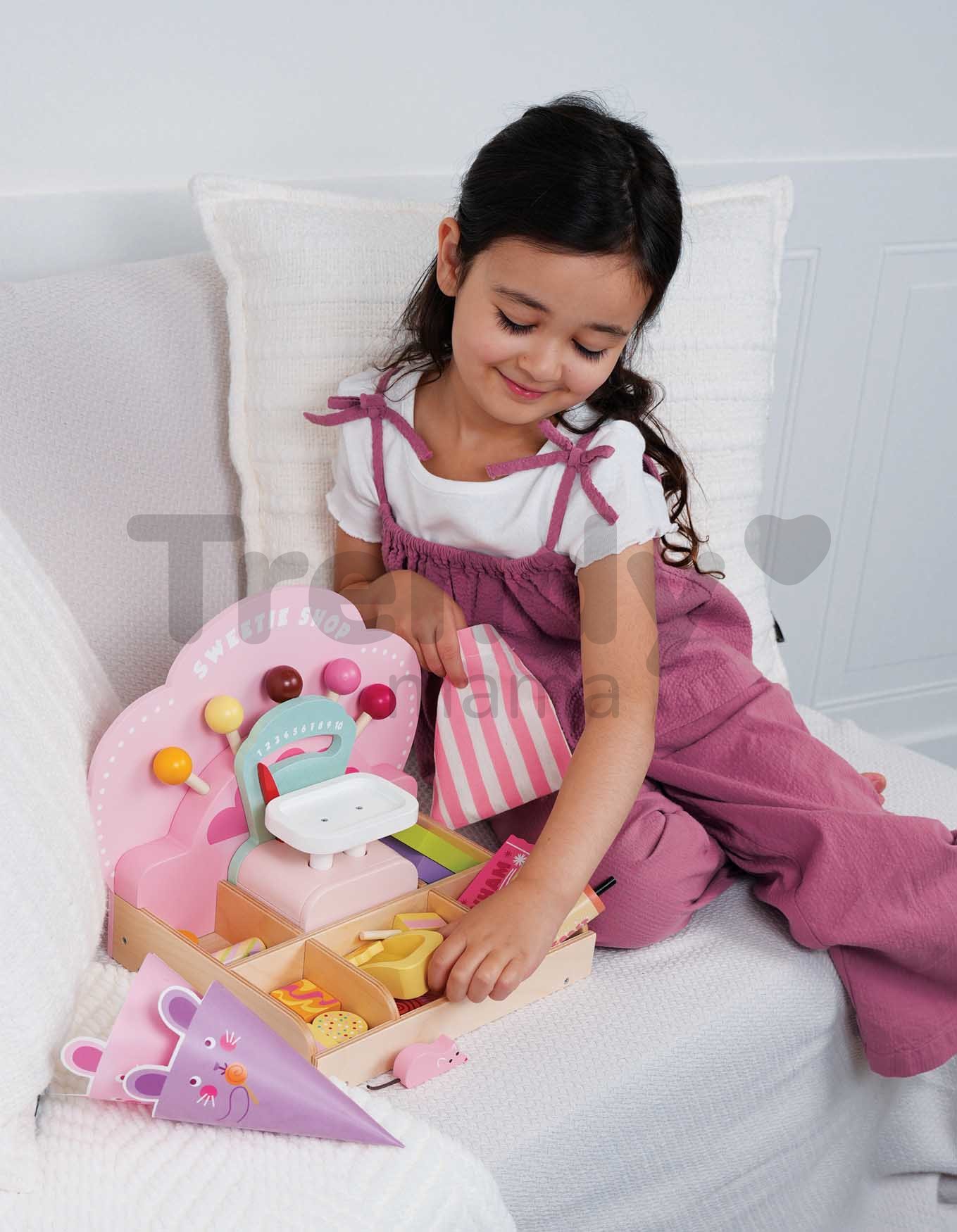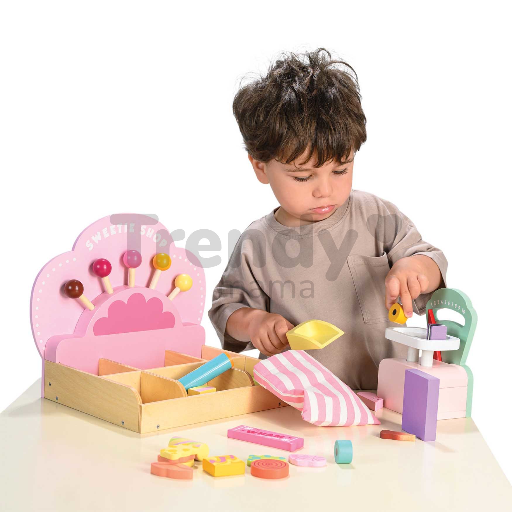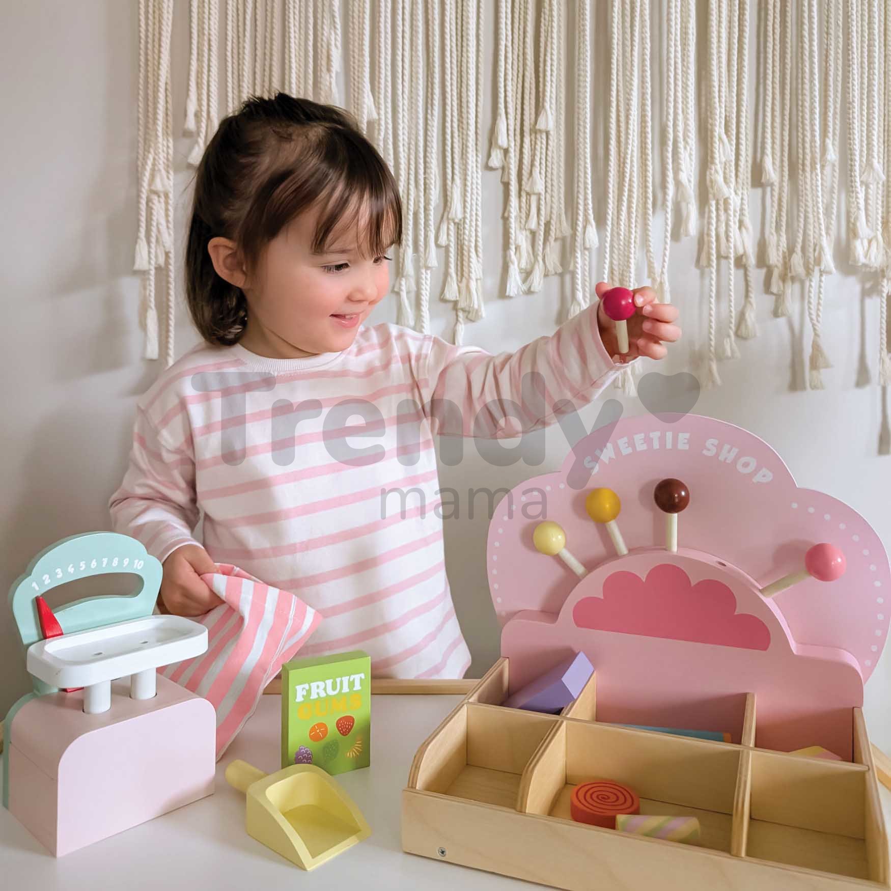Magazinul de dulciuri Sweetie Shop din lemn este un cadou excelent pentru toți copiii de la 3 ani, creat de designerii de top ai brandului Tender Leaf Toys direct în Marea Britanie. Magazinul retro din lemn este echipat cu 6 compartimente, în care micii vânzători își pot depozita diverse replici de dulciuri din lemn, cum ar fi bomboane, gumă de mestecat, lollipopuri și batoane de ciocolată. De asemenea, copiii vor fi încântați de cântarul din lemn, cu ajutorul căruia își vor cântări dulciurile și le vor ambala în pungi de hârtie pentru clienții lor. Magazinul de dulciuri roz va fi perfect pentru jocurile de rol alături de prieteni și frați, stimulându-le imaginația și abilitățile de comunicare într-un mod jucăuș.