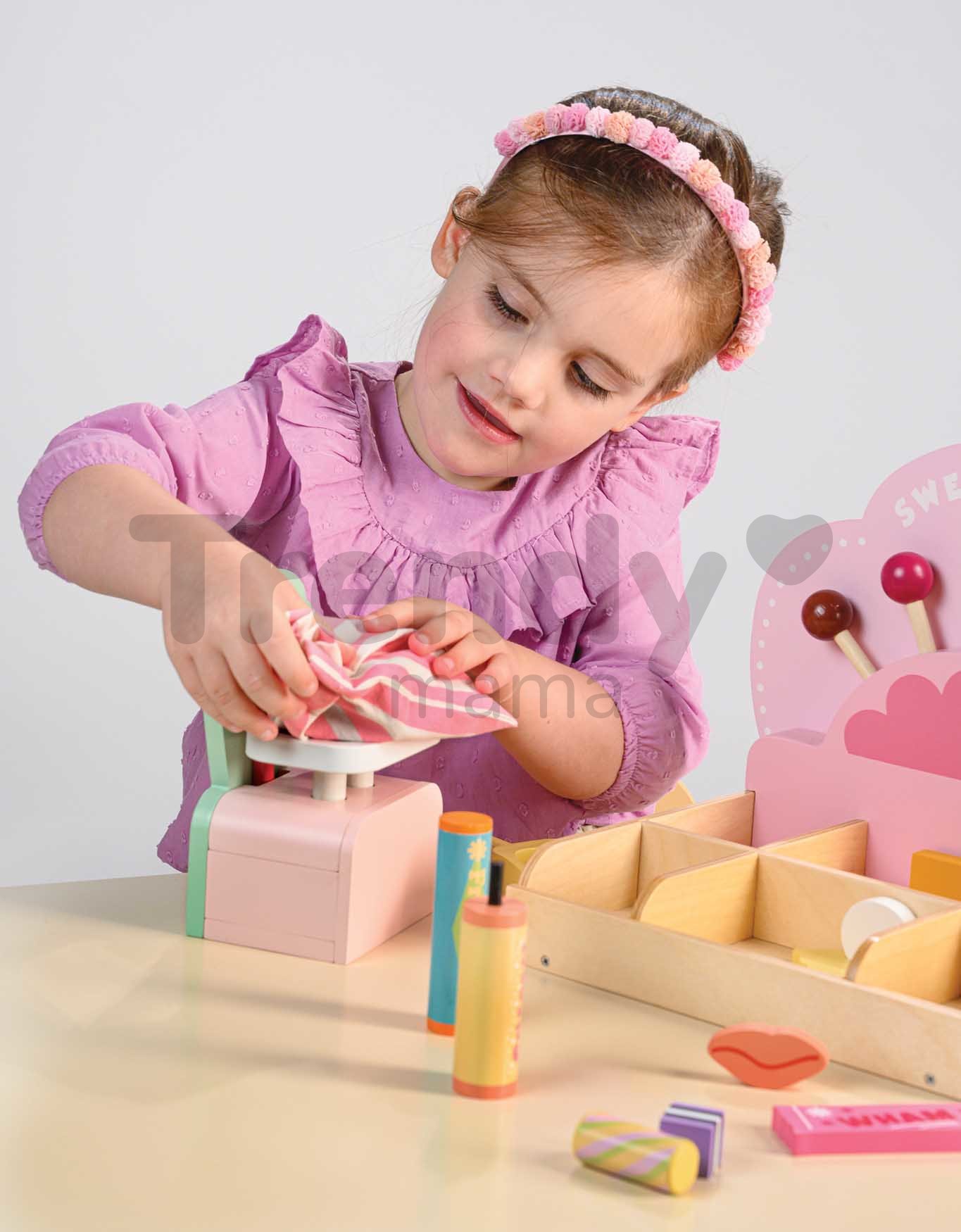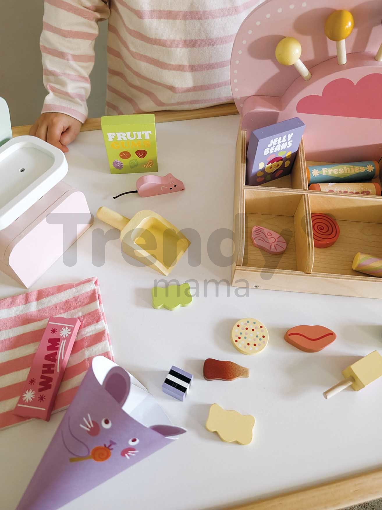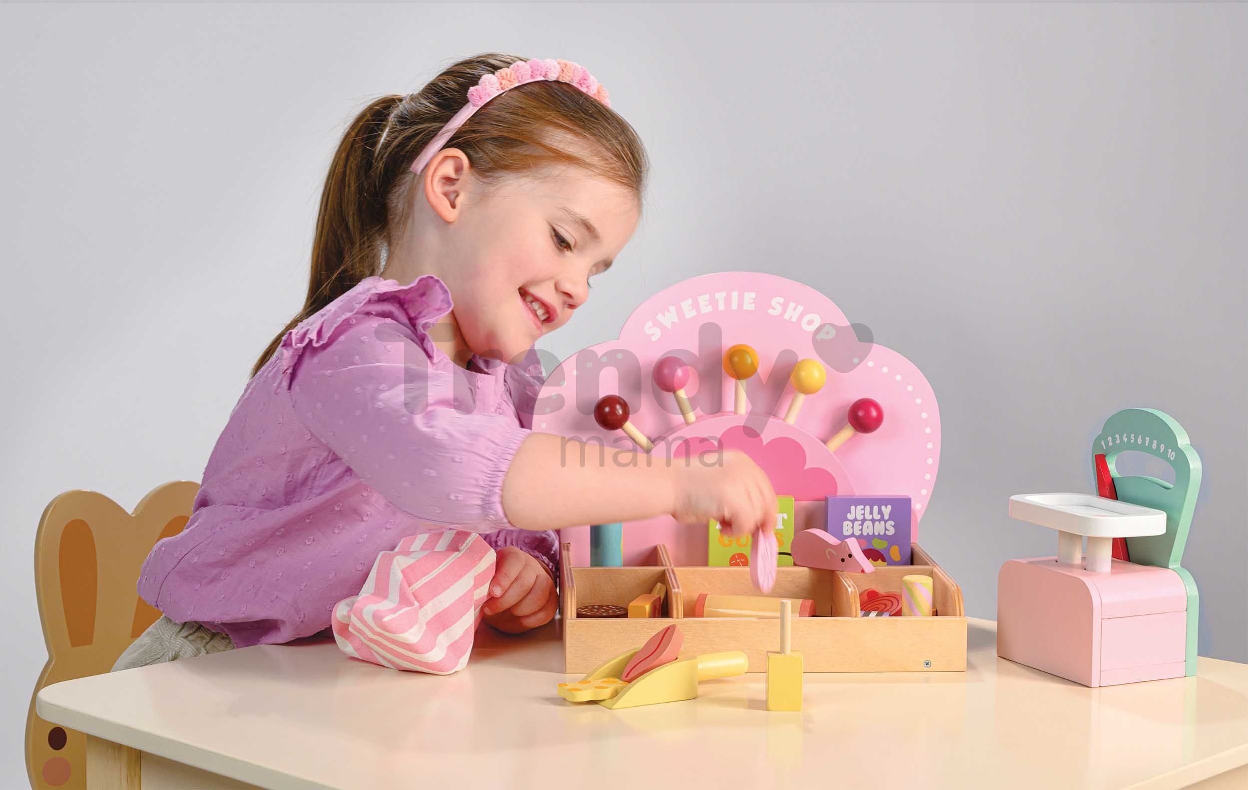 Magazinul de dulciuri Sweetie Shop din lemn este un cadou excelent pentru toți copiii de la 3 ani, creat de designerii de top ai brandului Tender Leaf Toys direct în Marea Britanie. Magazinul retro din lemn este echipat cu 6 compartimente, în care micii vânzători își pot depozita diverse replici de dulciuri din lemn, cum ar fi bomboane, gumă de mestecat, lollipopuri și batoane de ciocolată. De asemenea, copiii vor fi încântați de cântarul din lemn, cu ajutorul căruia își vor cântări dulciurile și le vor ambala în pungi de hârtie pentru clienții lor. Magazinul de dulciuri roz va fi perfect pentru jocurile de rol alături de prieteni și frați, stimulându-le imaginația și abilitățile de comunicare într-un mod jucăuș.