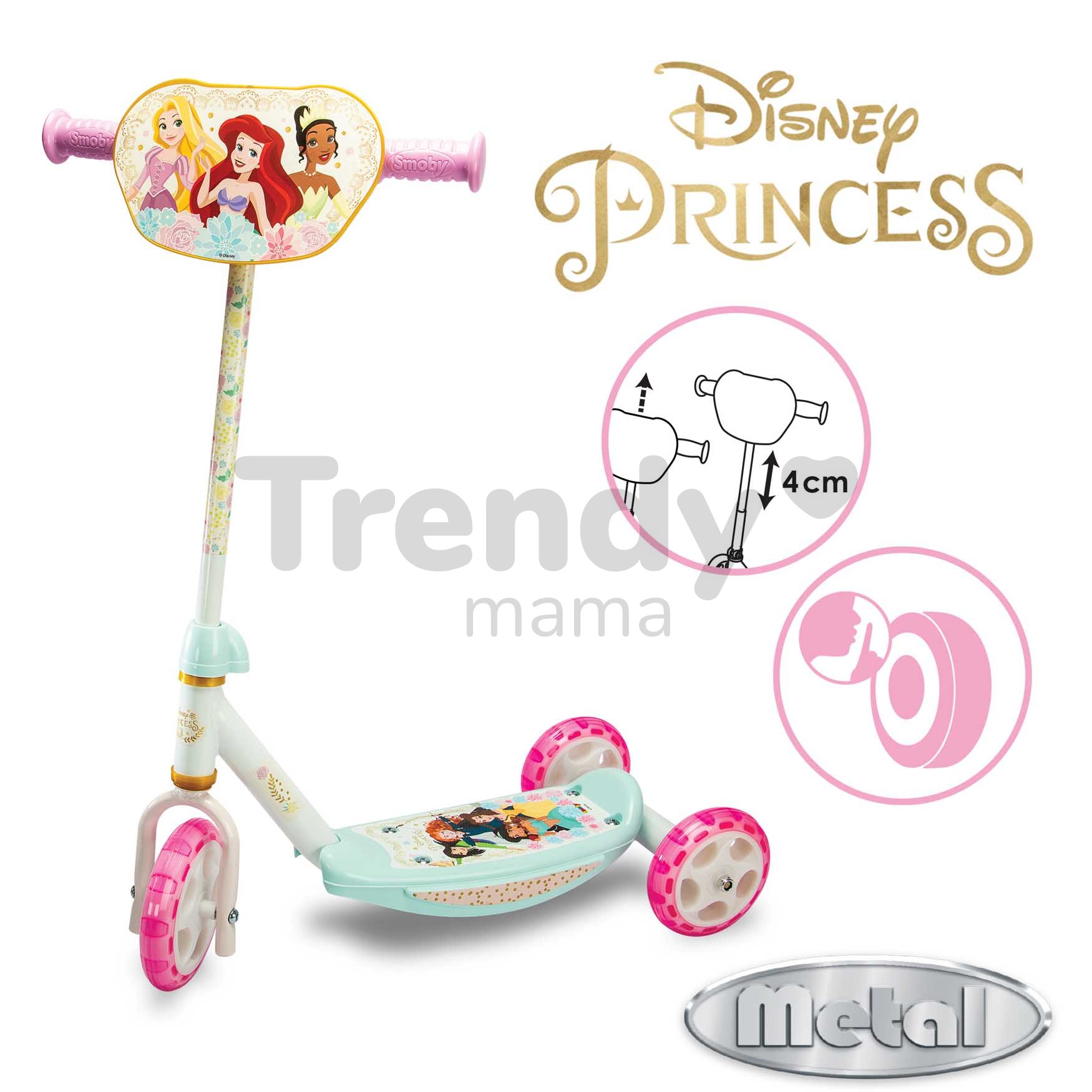 Trotineta cu trei roți creată de designerii francezi de la Smoby este un cadou minunat pentru toți copiii, în special pentru fetițele de la 3 ani în sus. Trotineta, realizată într-o nuanță de roz, este decorată pe ghidon cu o emblemă cu imaginea prințeselor Disney. Datorită cadrului său complet metalic și sistemului stabil cu trei roți, trotineta se remarcă printr-o durabilitate ridicată, fiind perfectă pentru micile aventuri pe roți. Ghidonul poate fi reglat la o înălțime maximă de 67 cm, adaptându-se astfel înălțimii copilului dumneavoastră.