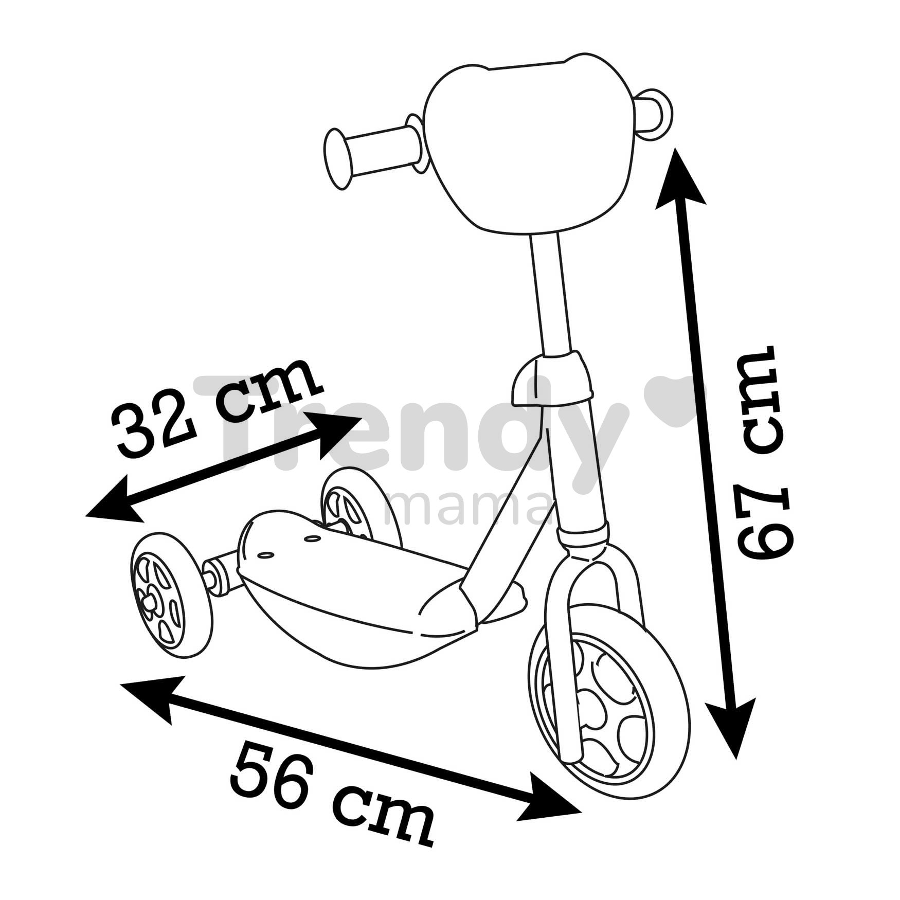 Roțile trotinetei sunt protejate împotriva perforării și, dacă este necesar, pot fi ușor demontate și înlocuite cu altele noi. Trotineta modernă cu trei roți este mult mai stabilă, sigură și confortabilă decât o trotinetă clasică, având o capacitate maximă de susținere de 20 kg. Dimensiunile totale ale trotinetei sunt 56*32*67 cm. Pentru o deplasare lină și silențioasă, trotineta este echipată cu roți din cauciuc, care aderă excelent pe orice suprafață, iar ghidonul este prevăzut cu grip de calitate.